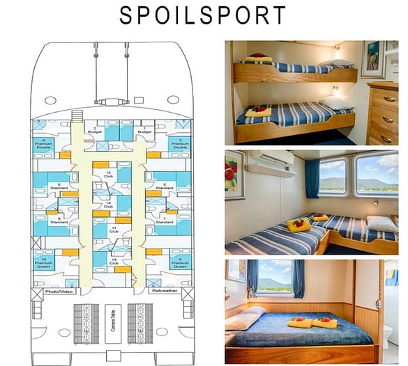 To maximise your diving and snorkelling experience, travel aboard Spoilsport, Australia's most awarded diving liveaboard. A custom built vessel with superb dive and guest facilities. Spoilsport has a twin hull design which maximises stability and passenger comfort in all conditions. Measuring 30m in length, Spoilsport has a dedicated crew of 12. You will have everything you need for a comfortable, enjoyable liveaboard dive expedition, Guest cabins are a combination of double and twin share. All are air-conditioned and serviced daily. Relax in the spacious lounge bar inside, or head up to the sun deck and enjoy the view over the reef.