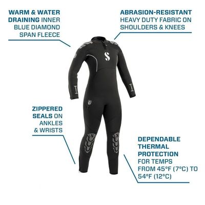 • CE certified as a Class A dive suit -- rated for water temperatures ranging from 45ºF (7ºC ) to 54ºF (12ºC).
